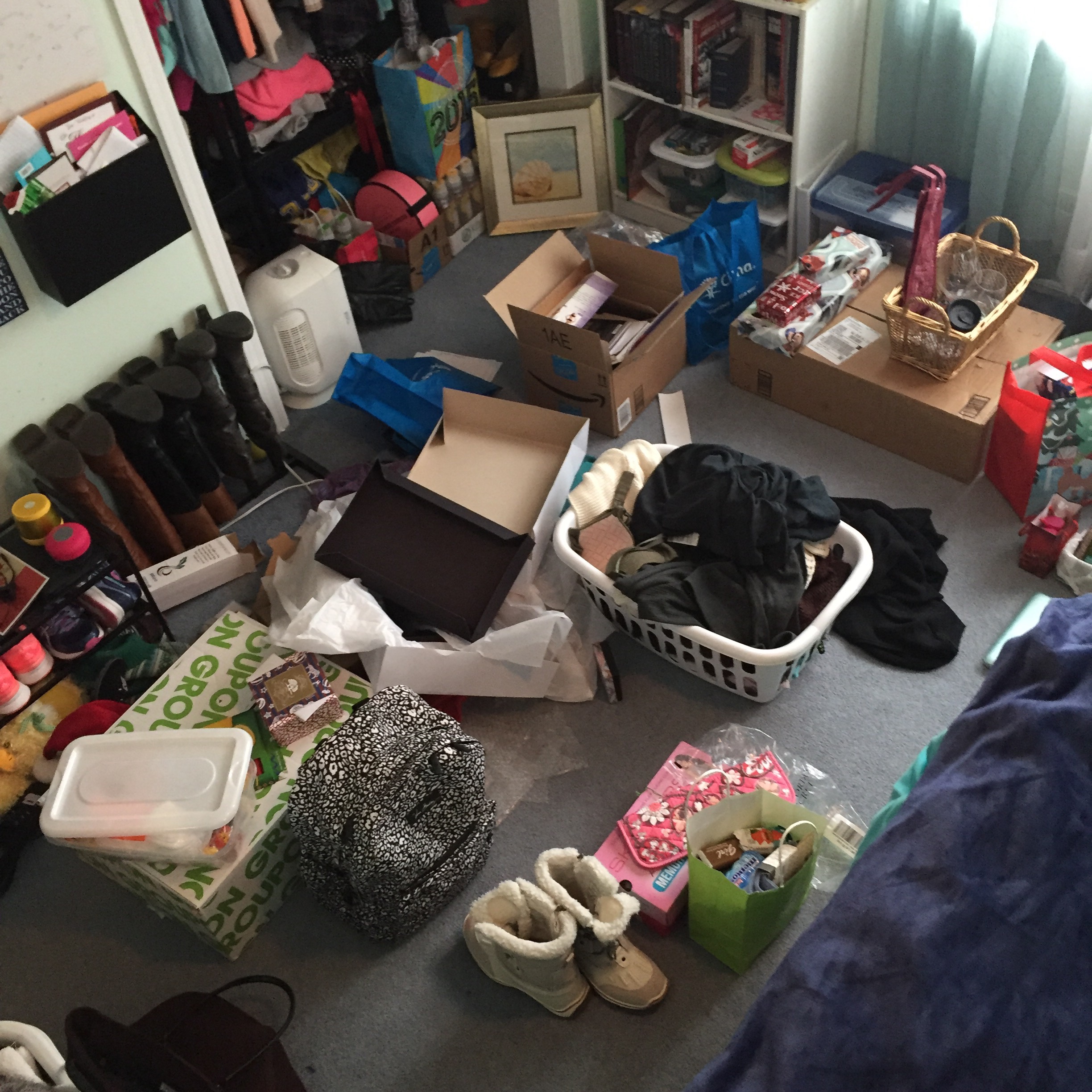 I won’t lie, my bedroom is always messy. But shoving all your Christmas presents in there, plus the ones you haven’t given yet, PLUS trying to make the rest of the house look clean for guests (aka just shove everything in my room). I also really need to do some laundry (not seen in photo). And this is only half my room!